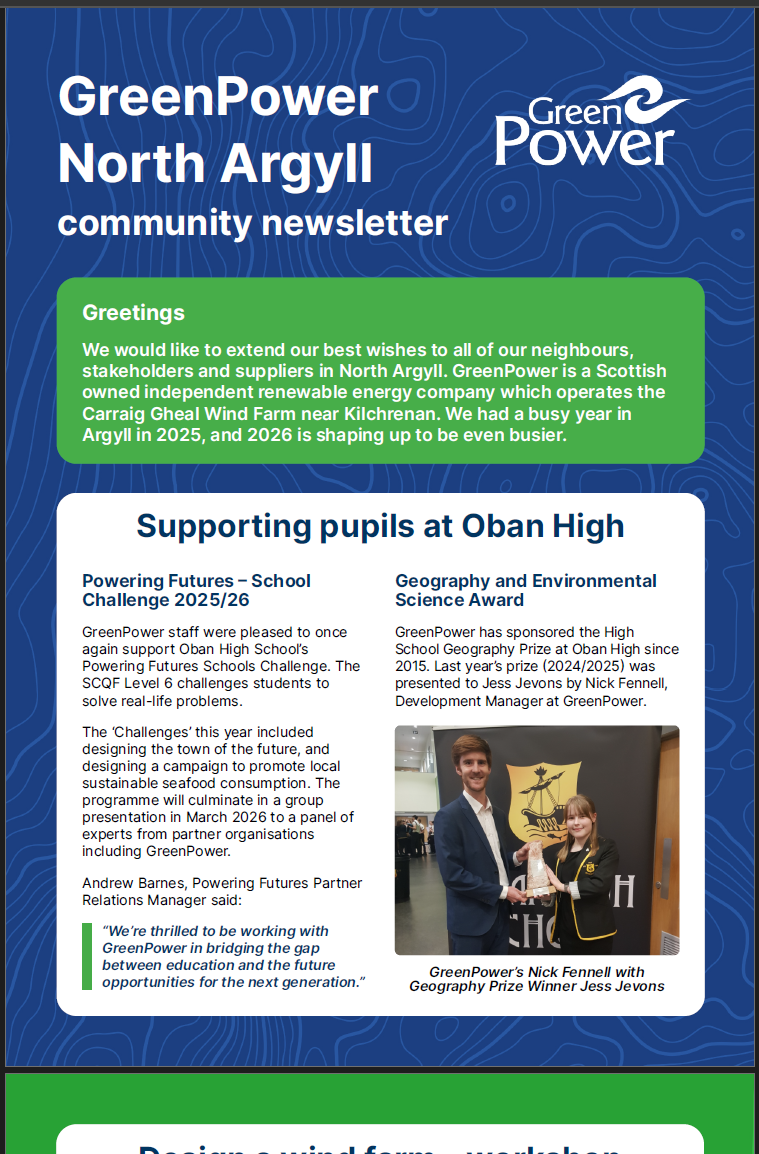 Our GreenPower community newsletter provides an update on a range of activities and initiatives we have recently been involved in within the North Argyll areas surrounding our Carraig Gheal Wind Farm and proposed Barachander project.