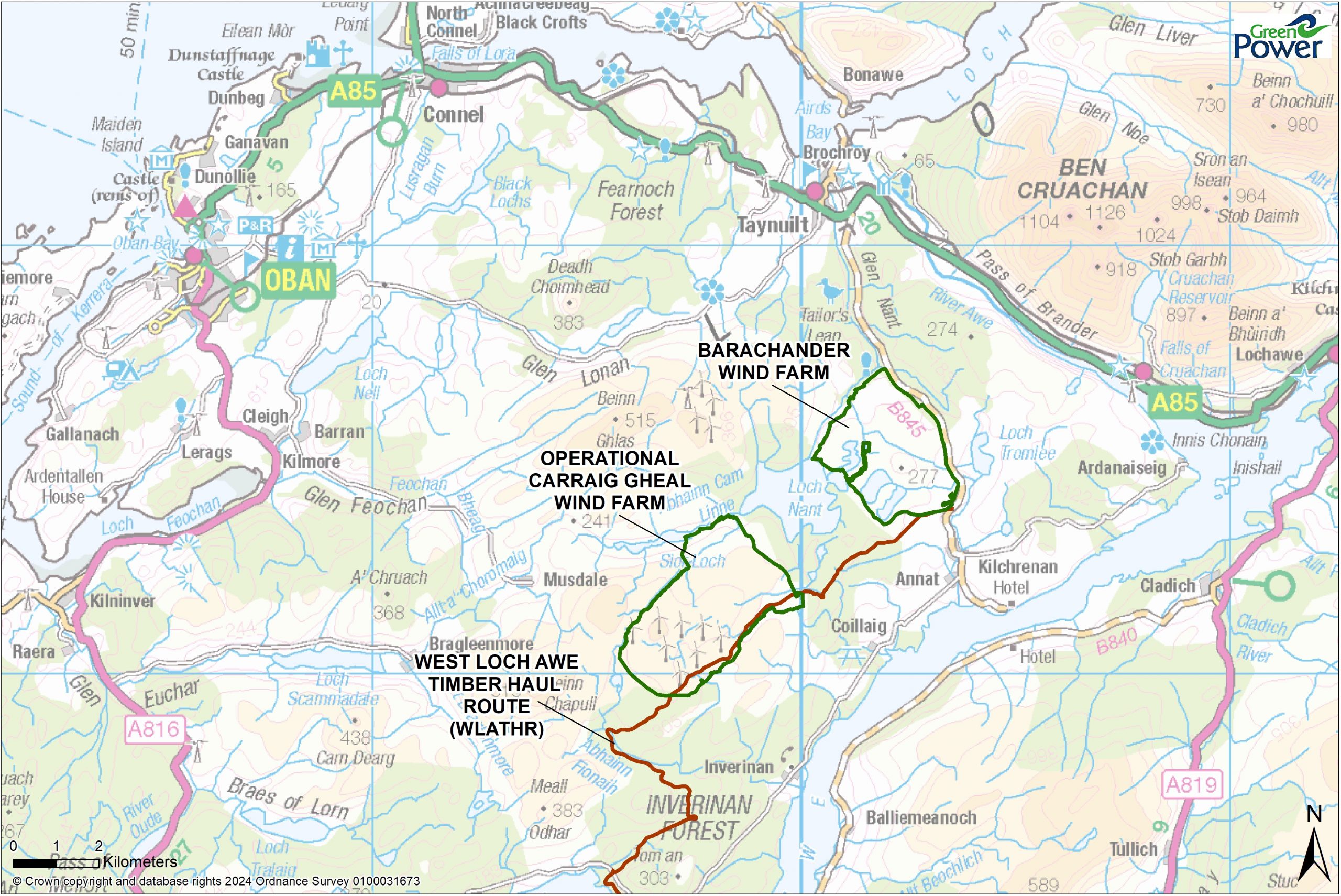 WLATHR upgrades – the West Loch Awe Timber Haul Route (WLATHR) is a 35km access route, jointly funded by GreenPower for Carraig Gheal Wind Farm deliveries. This will be reused for Barachander, helping keep construction traffic off local roads. Some sections will require upgrades to handle larger turbine components, which is being factored into the design.