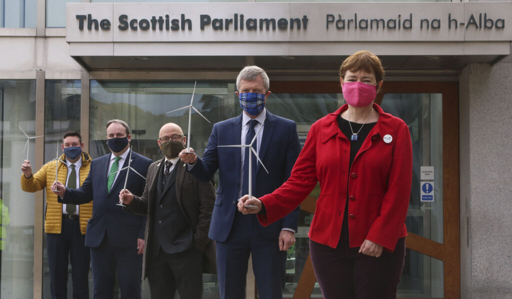 Politicians from all Scotland’s main parties today (27th October) gathered outside Holyrood to demonstrate their support for renewable energy as a key part of a green recovery and essential to help tackle the climate emergency – by holding aloft a model onshore wind turbine. The statement of support helps to kick off the Scottish Renewable Energy Festival which runs for the next two weeks, up to 6th November. (1)