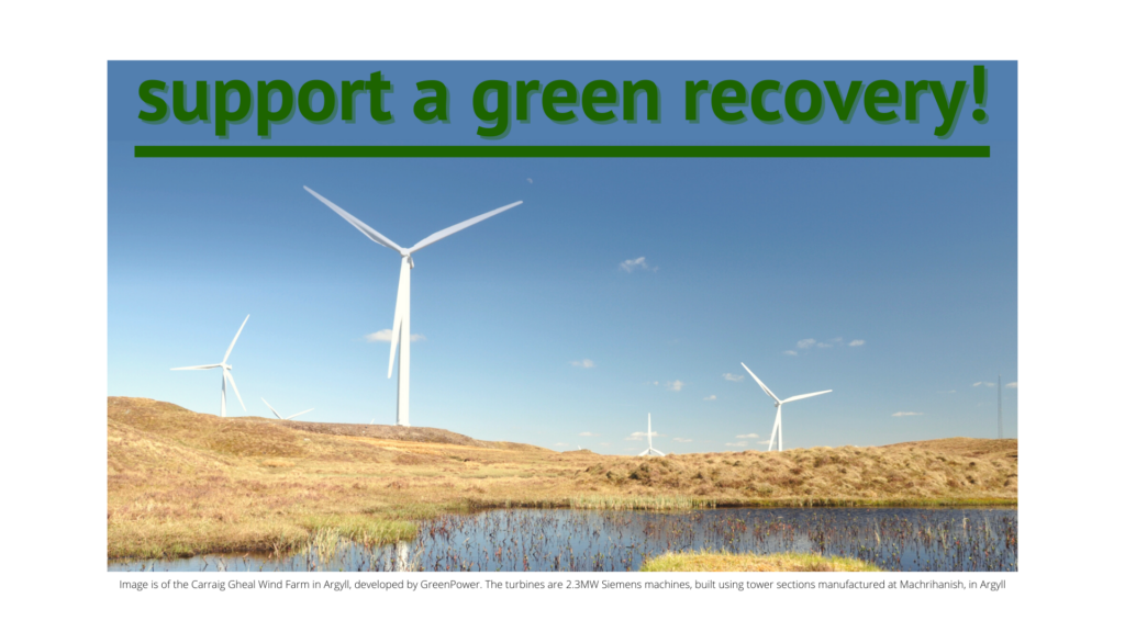 For those who are using video conferences and zoom calls, GreenPower is promoting the use of a poster for use as a ‘virtual background’. The poster shows a picture of the Carraig Gheal Wind Farm in Argyll developed by GreenPower, with the title ‘support a green recovery’. The wind farm was constructed in 2014 using towers made in Scotland at the Machrihanish manufacturing plant near Campbeltown. (Download the poster)